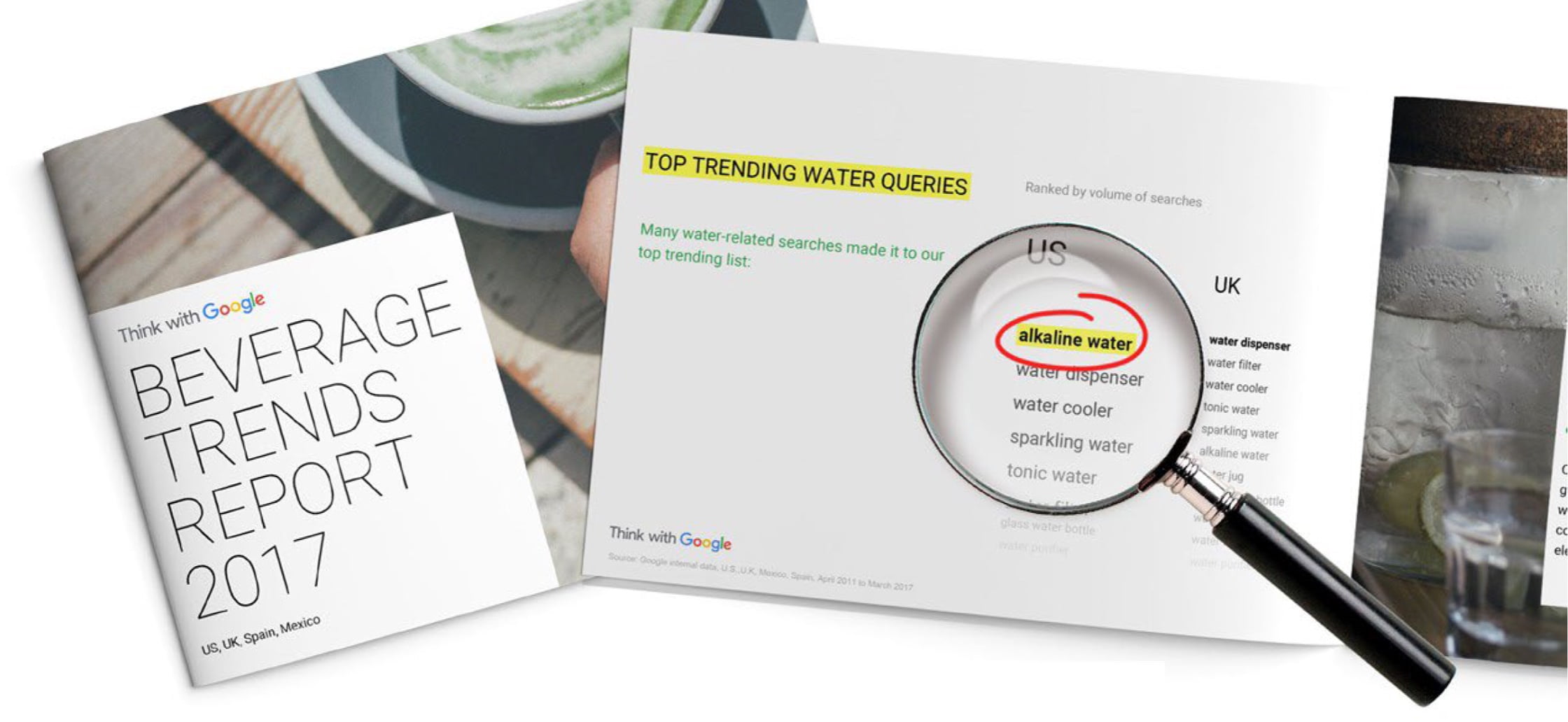 Based on Google search data, alkaline water is top trending water search term. And it’s not abating; according to Google data it has been a sustained rising trend since 2012.